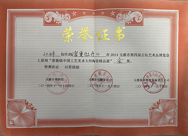 2014年3月《春韻》在二十九屆中國北京國際禮品工藝品展覽會(huì)中榮獲工藝美術(shù)金獎(jiǎng)。2014年11月《富貴牡丹》在2014玉溪市第四屆古玩藝術(shù)品博覽會(huì)上獲得“景德鎮(zhèn)中國工藝美術(shù)大師陶瓷精品展”金獎(jiǎng)。2015年5月《天香富貴醉春園》榮獲2015年中國工藝美術(shù)“百花獎(jiǎng)”(莆田)評(píng)比銅獎(jiǎng)。2014年6月《牡丹富貴》在第四屆“大地獎(jiǎng)”評(píng)比榮獲銅獎(jiǎng)