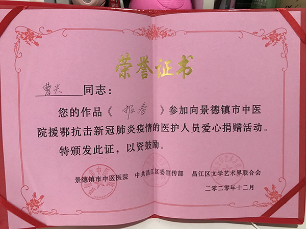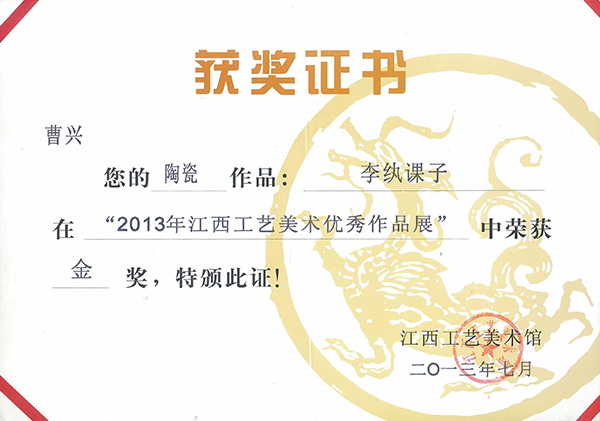2013年粉彩瓷板作品《李紈課子》榮獲“江西工藝美術(shù)優(yōu)秀作品”大獎(jiǎng)賽金獎(jiǎng),并且 被江西工藝美術(shù)館收藏。
