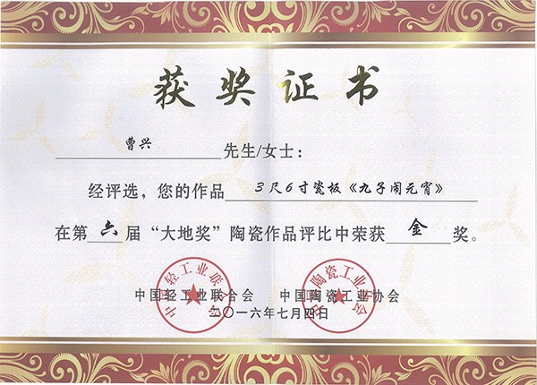 2016年粉彩瓷板《九子鬧元宵》榮獲第六屆“大地獎(jiǎng)”金獎(jiǎng)